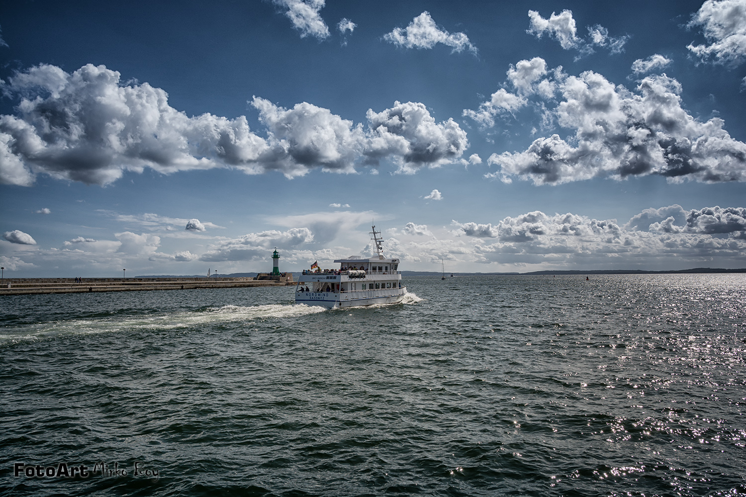 Fahrt Kreidefelsentour mit der MS Nordwind. Links die Mole und der Leuchtturm, Leuchtfeuer, Bootswelle, Ausflugsschiff, Schiffsreise