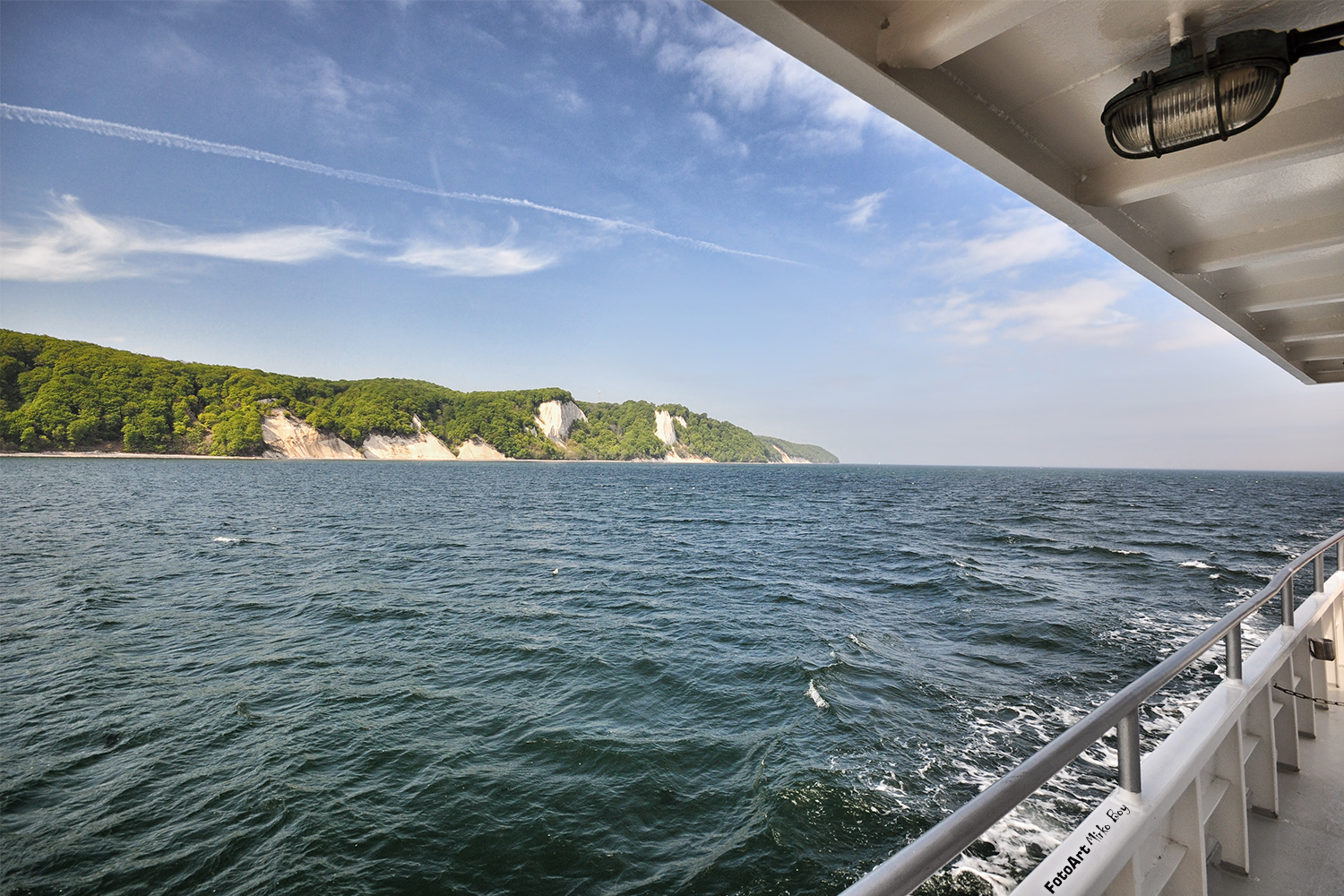 Fahrt zu den Kreidefelsen, Königsstuhl, Stubbenkammer, Vorbei am Nationalpark Jasmund mit der MS Nordwind oder der MS Rügen. Reederei, Bootstour, Schiffsausflug, Fahr auf dem Meer, Reling, Seekrank, Sehenswürdigkeit, Seeseite, Wellen und Schaum an Planke, über Bord, Tagestörn, Motorschiff
