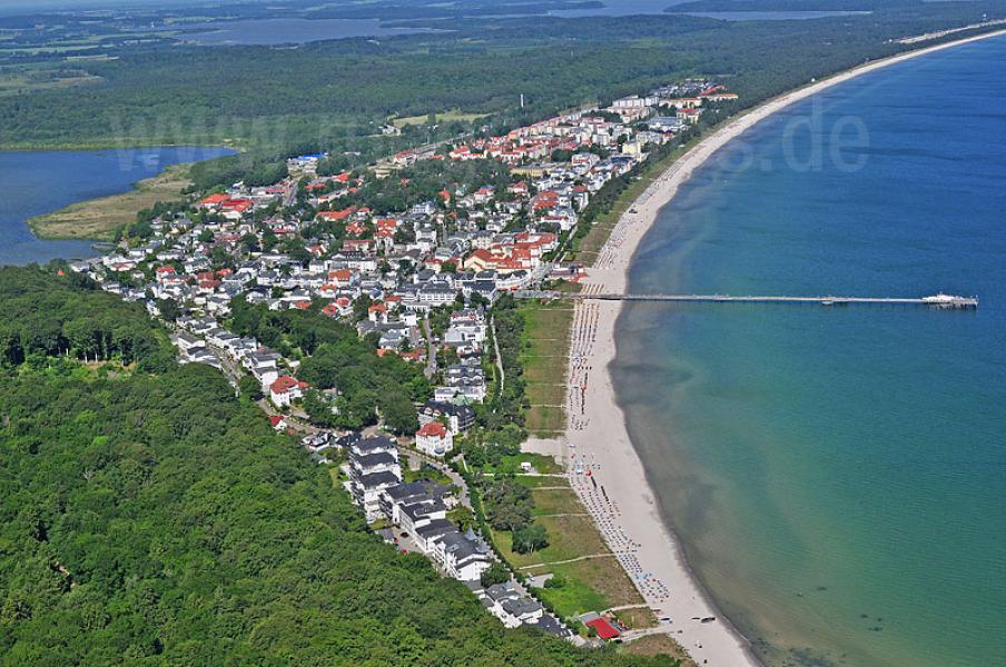 Ostseebad Binz, Flugzeug, Ortskern, Strandpromenade, Dünen, Sandstrand, Seebrücke, Meer, Proraer Wiek, Schmachter See, Waldgebiet Granitz, Blick bis nach Prora