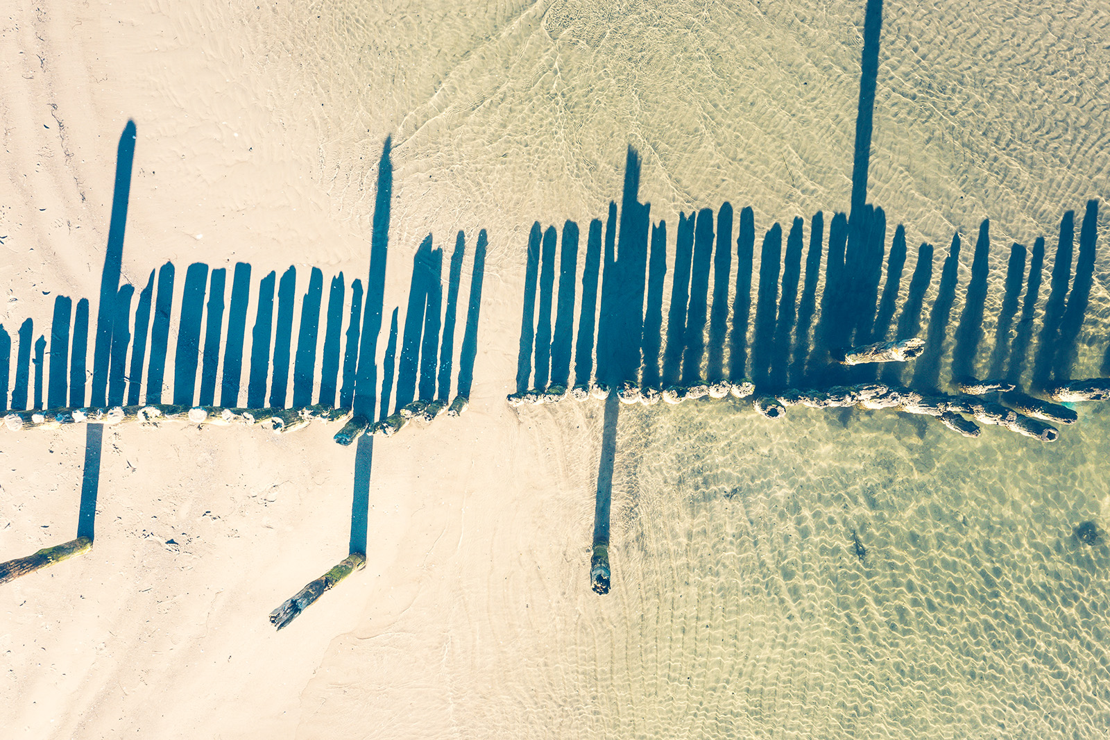 Draufsicht Drohne Buhnen Strand Ostsee Schatten Sonne Moody-Look