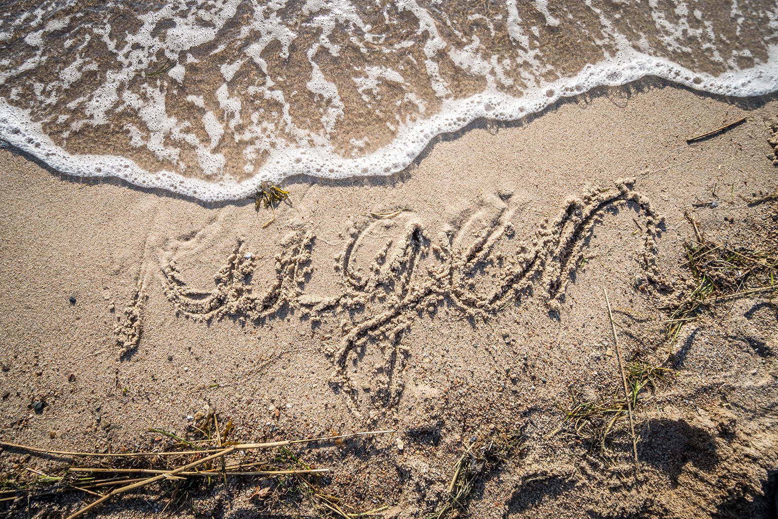 Schrift Insel Rügen in den Sand gemalt, Welle, Naturstrand