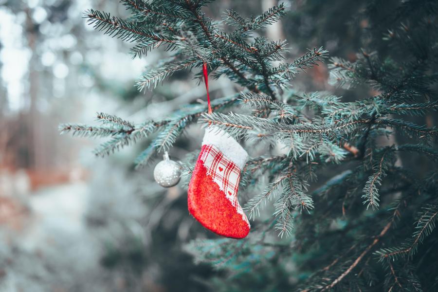 Nikolaussocken, Socken, Weihnachten, Weihnachtszeit, Weihnachtssocken, Weihnachtsstrumpf, Tannenzweig, Schnee, Baumstumpf, Winterwald