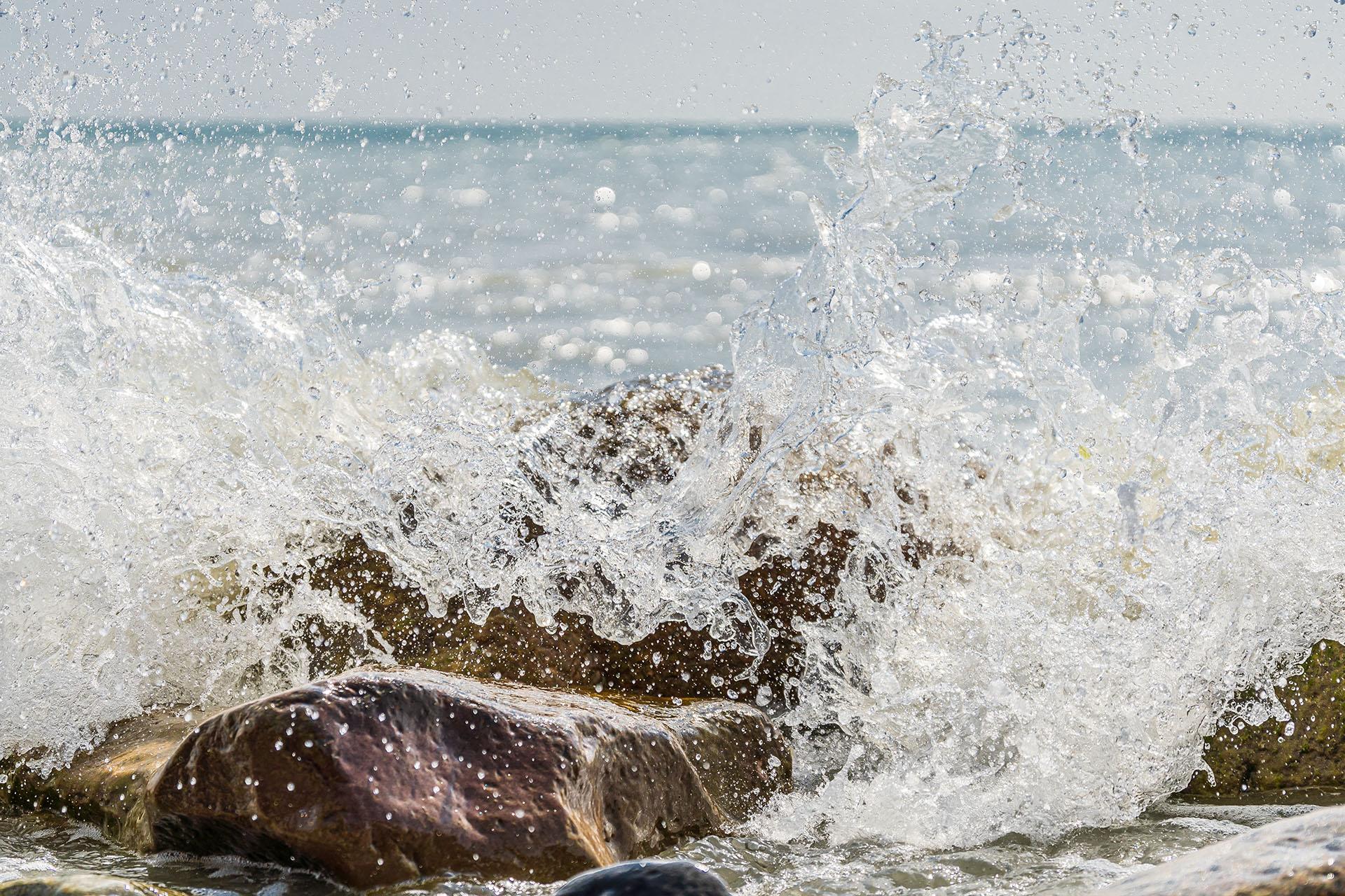 Strand, Stein, Findling, Welle, Splash, Spritzer, Wellenspritzer, Ostsee