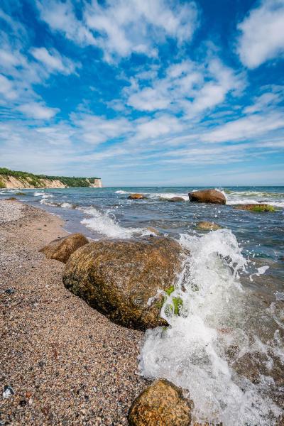 Fischerdorf Vitt, Strand, Steinstrand, Ostsee, Steilküste, Ostseeküste, Stein, Welle, Hochformat,