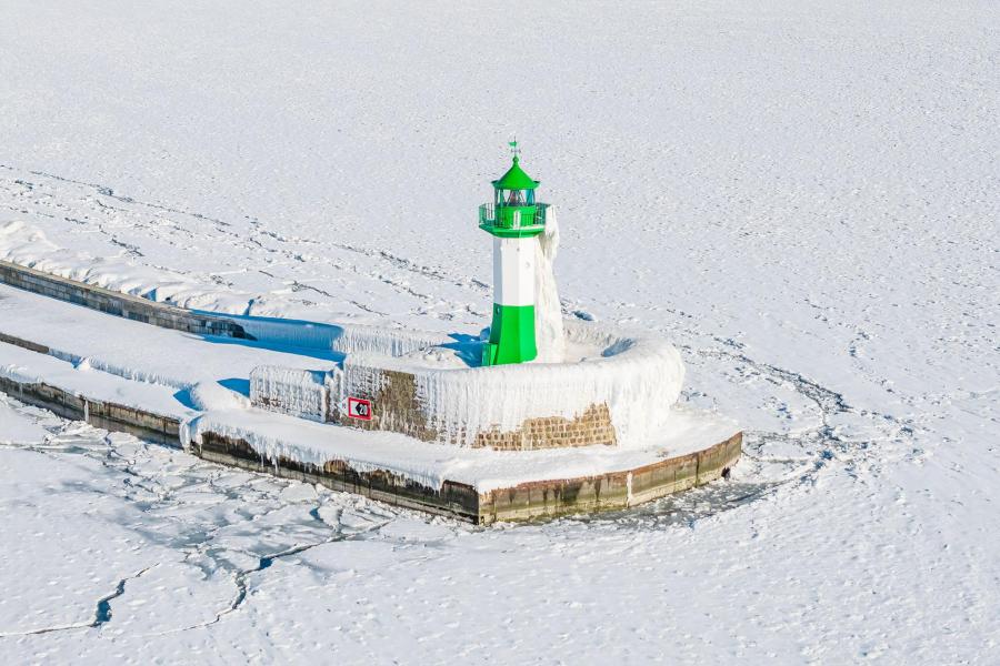 Luftbild, Drohnenfotos, Leuchtturm, Winter, Eis, Schnee, Stadthafen, gefrorene Ostsee,