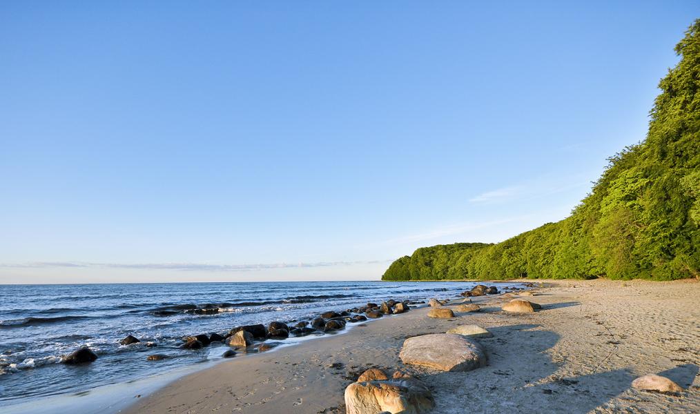 Abendliche Stimmung am Binzer Strand. Die bald untergehende Sonne erzeugt lange Schatten an den Steinen im Sand, die im Wasser sanft von den Wellen umspielt werden. Das Hochufer ist begrünt mit einem zum Wandern einladenden Waldgebiet, der Granitz.