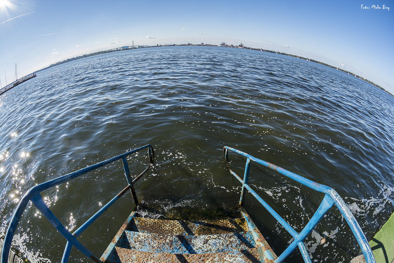 Verrostete Treppe am Strelasund, der Blick von der Insel Rügen nach Stralsund aufs Festland