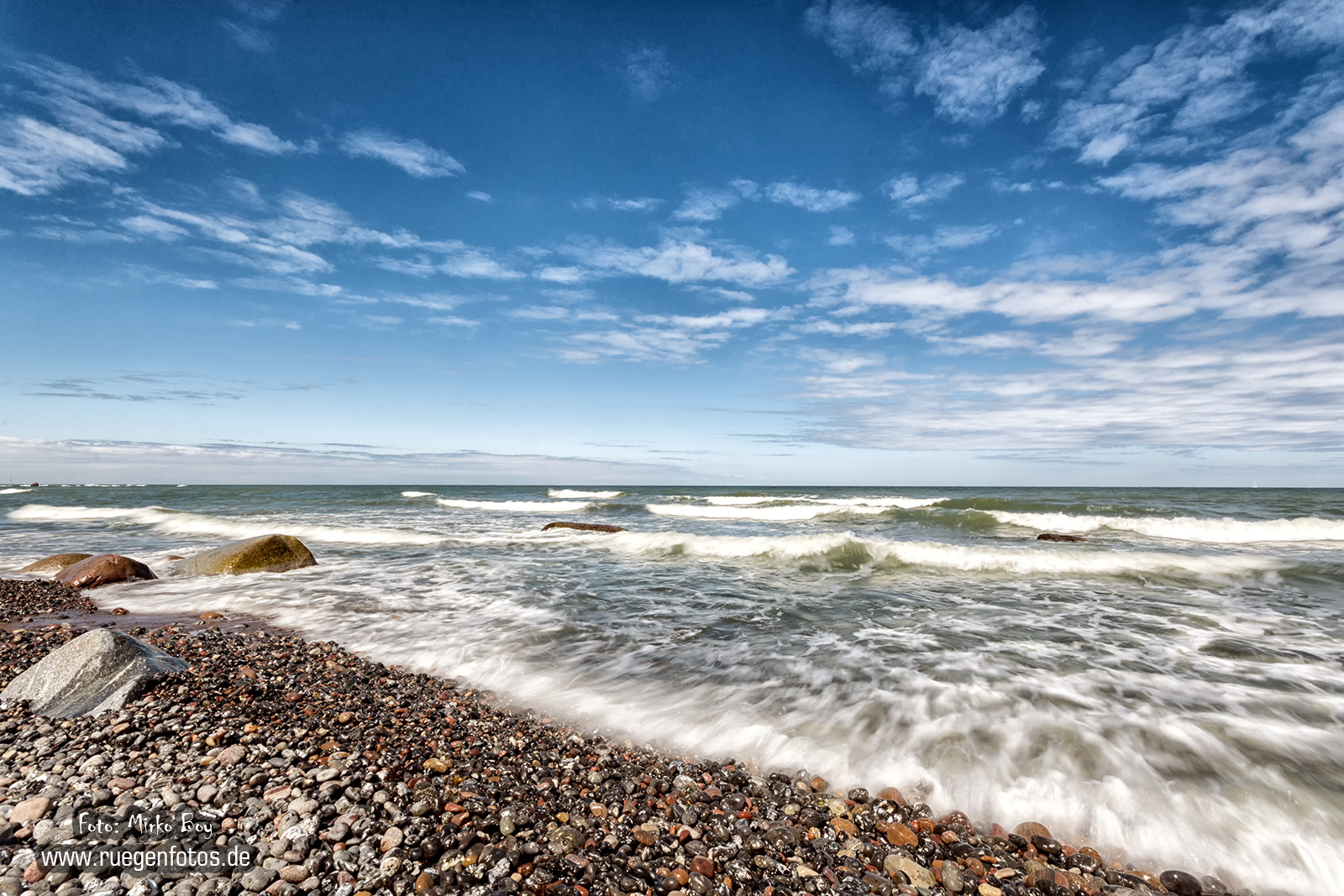 Der Steinstrand an der Kreideküste Rügens. Blick auf die Ostsee, Findling, Meer, Wellen, Schaum, Steine, Naturstrand, Horizont, Himmel, Wolken