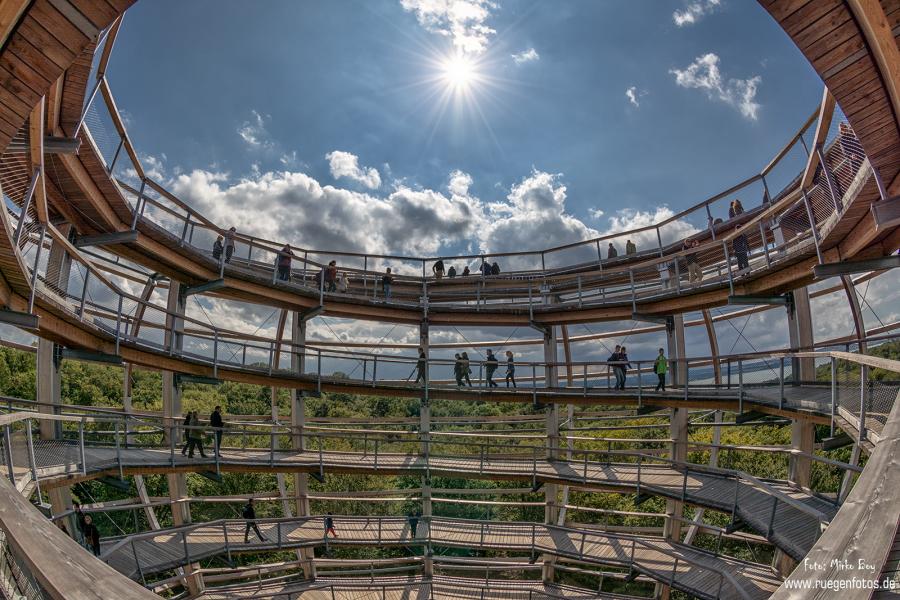 Adlerhorst Naturerbezentrum Rügen. Über den Baumwipfelpfad (Baumwipfelweg) gelangt man auf den Turm (Adlerhorst), zu Fuß immer im Kreis herum.